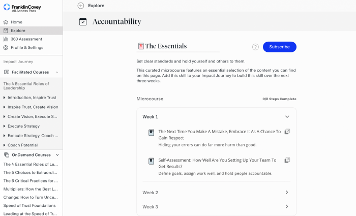 FranklinCovey’s OnDemand Microcourses are skill-specific learning resources that help learners adopt new, effective mindsets and behaviors by investing only a few minutes per week.